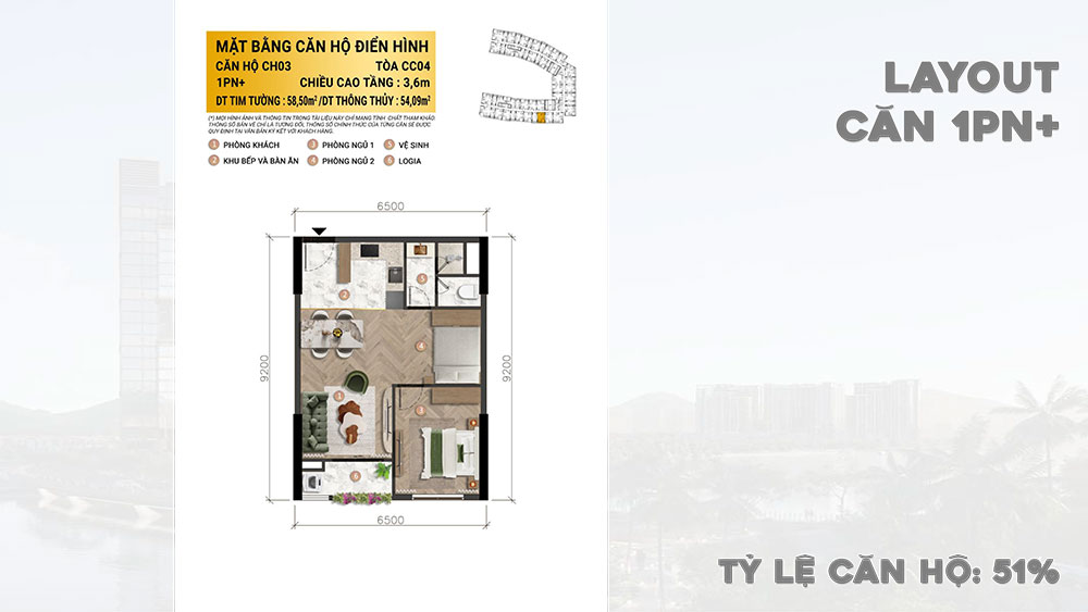 Diện tích: 49.96m2 – 54,09m2